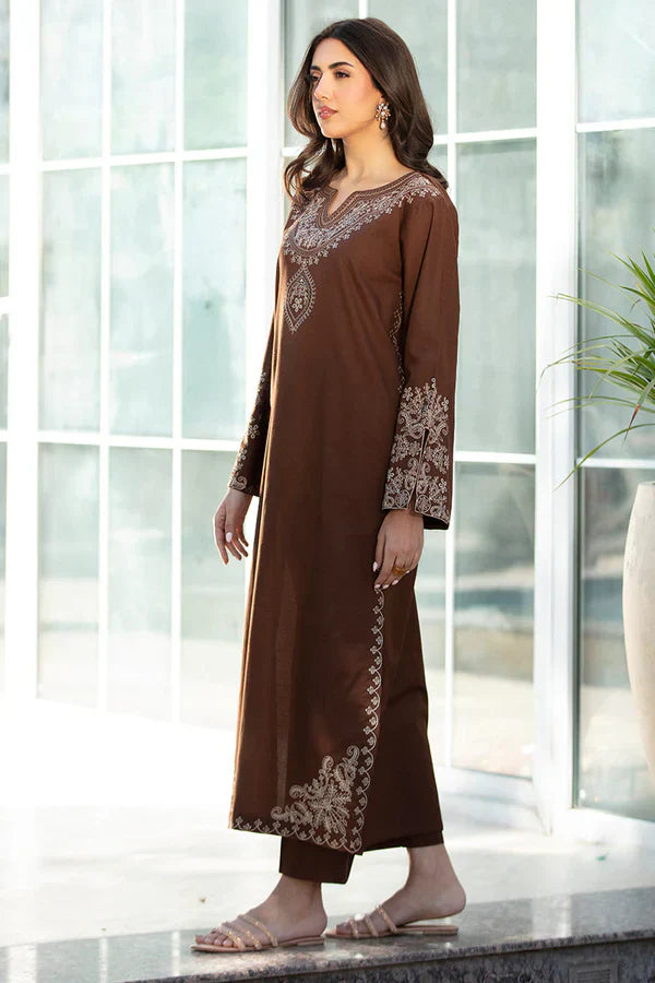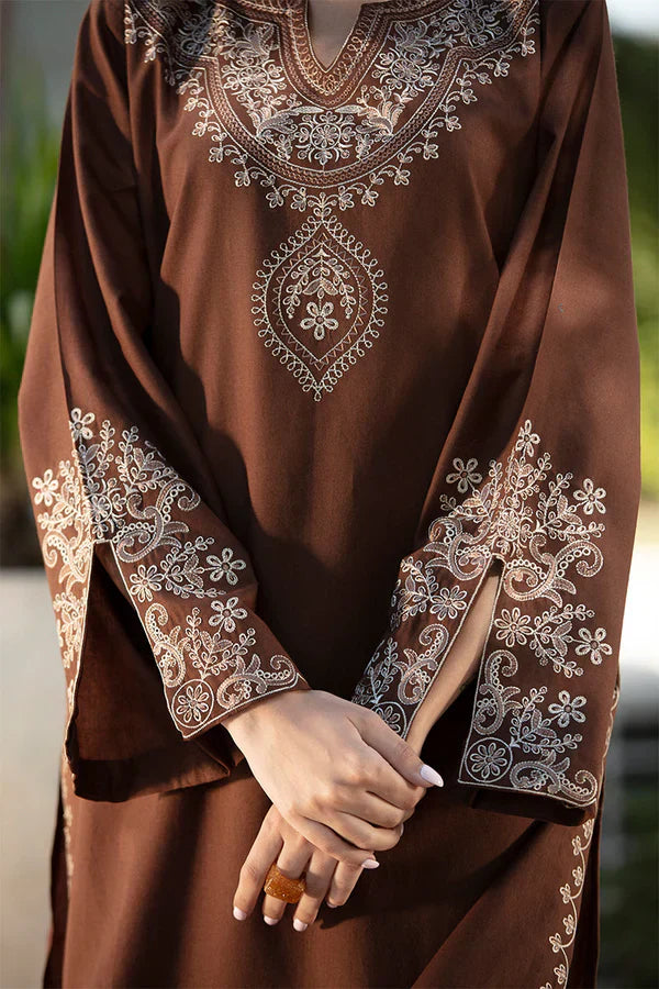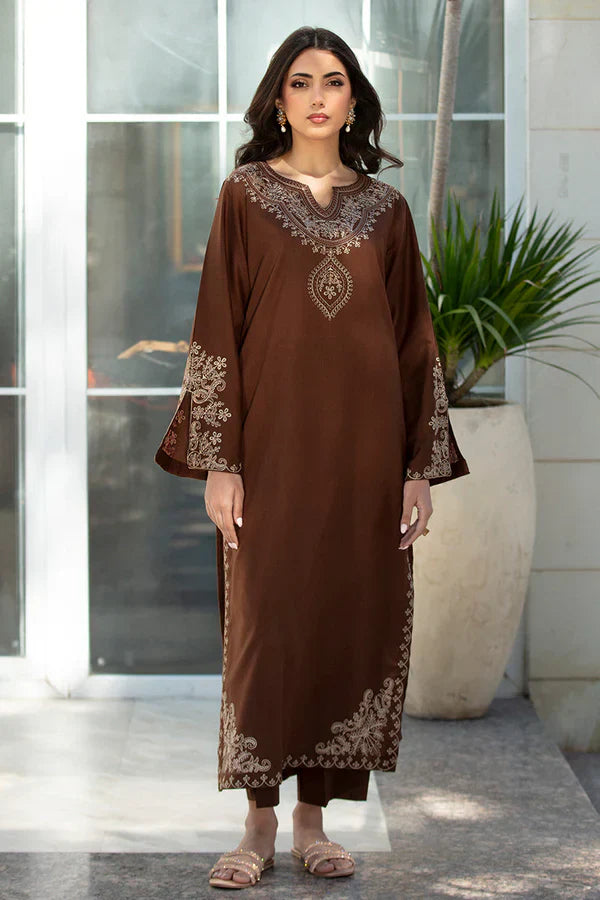 Indulge in the timeless elegance of Chocolate Aura, a stunning 2-piece embroidered suit designed for women who love classic sophistication. Crafted in a rich chocolate brown tone, this outfit features intricate thread embroidery on the neckline, sleeves, and borders, making it perfect for festive events, casual gatherings, or evening wear.