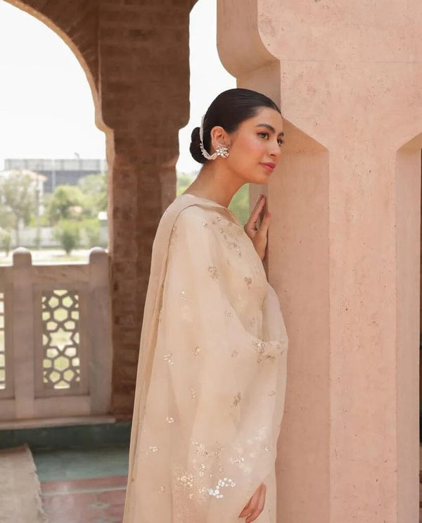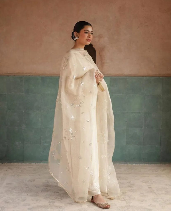 Elevate your ethnic wardrobe with the timeless charm of the Luma 3PC Dress, crafted from premium breathable cotton fabric for all-day comfort and elegance. Designed in a soft ivory tone with delicate detailing, this graceful ensemble includes a flowy cotton shirt and matching trousers, beautifully paired with a lightweight organza dupatta for a refined, airy finish.