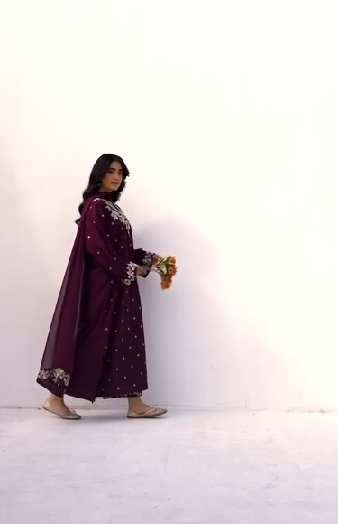 Introducing Royal – Premium 3Pc , a beautifully crafted 3-piece embroidered linen suit designed for women who love timeless elegance with modern sophistication. This stunning deep-plum outfit features intricate embroidery across the shirt and sleeves, giving it a luxurious festive appeal perfect for winter gatherings, family events, and seasonal celebrations.